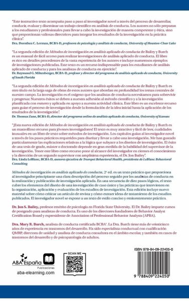 Métodos de investigación en análisis aplicado de conducta, 2a ed. es un texto práctico que proporciona al investigador principiante una clara descripción del proceso seguido por los analistas de conducta en la realización y publicación de investigación aplicada. En una secuencia de diez pasos lógicos, el texto cubre los elementos del diseño de una investigación de caso único y las prácticas que intervienen en la organización, aplicación y evaluación de los estudios de investigación. Esta edición incluye nuevo material sobre cómo criticar un artículo de revista y cómo extraer ideas de tratamiento de los estudios publicados. El investigador novel se expone a un texto de estilo conciso y eminentemente práctico. El libro está compuesto de cinco partes: PARTE I UNA BREVE INTRODUCCIÓN A LA INVESTIGACIÓN EN ANÁLISIS DE CONDUCTA PARTE II MÉTODOS DE INVESTIGACIÓN EN EL ANÁLISIS APLICADO DE CONDUCTA: 10 PASOS PARA UNA INVESTIGACIÓN EXITOSA PARTE III EVALUACIÓN DE LA INVESTIGACIÓN CONDUCTUAL PARTE IV USO DE LOS RESULTADOS DE LA INVESTIGACIÓN APLICADA EN CONTEXTOS CLÍNICOS Y EDUCATIVOS PARTE V PUBLICAR ¿ Dr. Jon S. Bailey, profesor emérito de psicología en Florida State University. El Dr. Bailey imparte cursos de postgrado para analistas de conducta. Es uno de los directores fundadores de Behavior Analyst Certification Board y expresidente de Association of Professional Behavior Analysts (APBA). Dra. Mary R. Burch, analista de conducta certificada BCBA®. La Dra. Burch tiene más de veinticinco años de experiencia en trastornos del desarrollo. Ha sido especialista conductual con cualificación QMRP, directora de unidad y analista de conducta consultora en el ámbito escolar, y también en casos de trastornos del desarrollo y de psicopatología de adultos.