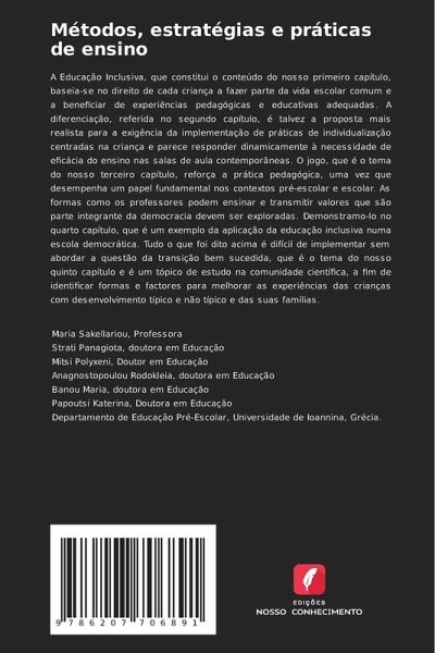 A Educação Inclusiva, que constitui o conteúdo do nosso primeiro capítulo, baseia-se no direito de cada criança a fazer parte da vida escolar comum e a beneficiar de experiências pedagógicas e educativas adequadas. A diferenciação, referida no segundo capítulo, é talvez a proposta mais realista para a exigência da implementação de práticas de individualização centradas na criança e parece responder dinamicamente à necessidade de eficácia do ensino nas salas de aula contemporâneas. O jogo, que é o tema do nosso terceiro capítulo, reforça a prática pedagógica, uma vez que desempenha um papel fundamental nos contextos pré-escolar e escolar. As formas como os professores podem ensinar e transmitir valores que são parte integrante da democracia devem ser exploradas. Demonstramo-lo no quarto capítulo, que é um exemplo da aplicação da educação inclusiva numa escola democrática. Tudo o que foi dito acima é difícil de implementar sem abordar a questão da transição bem sucedida, que é o tema do nosso quinto capítulo e é um tópico de estudo na comunidade científica, a fim de identificar formas e factores para melhorar as experiências das crianças com desenvolvimento típico e não típico e das suas famílias.