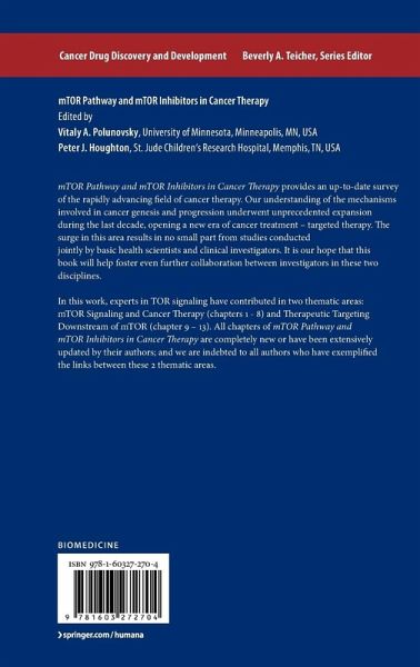 The main objective of this book is to provide an up-to-date survey of the rapidly advancing eld of cancer therapy. Moreover, since our knowledge in this area rapidly evolves, some data have got obsolete during the process of book editing. Our understanding of the mechanisms involved in cancer genesis and progression underwent unprecedented expansion during the last decade, opening a new era of cancer treatment - targeted therapy. The surge in this area results in no small part from studies conducted jointly by basic health scientists and clinical investigators. It is our hope that this book will help foster even further collaboration between investigators in these two disciplines. The target of rapamycin (TOR) was rst identi ed in Saccharomyces cerevisiae and subsequently in mammals (mTOR) as a conserved atypical serine/threonine kinase. In mammalian cells, mTOR exists in at least two multi-protein complexes that have critical roles in regulating cellular homeostasis and survival. As with many other areas of science, discovery of TOR signaling was fortuitous. Rapamycin was isolated as a product of the soil bacteria Streptomyces hygroscopicus, identi ed in a soil sample taken from the island of Rapa Nui (Easter Island). Rapamycin was rst discovered to be a potent antifungal agent and next as an immune suppressive drug. It was only later that it was found to be active as an antitumor agent in non-clinical models; although it was not developed for this indication. The history of rapamycin presents one of the rst examples of chemical genetics.