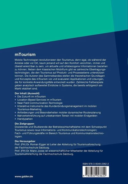 Theoretische Grundlagen und Konzepte.- Die Zukunft im mTourism - Ausblick auf Technologie- und Dienstentwicklung.- Location-Based Services im mTourismus - Quo Vadis?.- Mobile kontextsensitive Dienste für die Freizeit.- Interaktive Instrumente des Kundenbindungsmanagements im mobilen Tourismus-Marketing.- Neue Dimension von mobilen Tourismusanwendungen durch Near Field Communication-Technologie.- Anforderungen und Besonderheiten mobiler dynamischer Routenplanung im touristischen Outdoor-Kontext.- Prototypen und empirische Befunde.- QR-Schnitzeljagd Salzkammergut.- Mobile Information - "Erlebnis Grünes Band".- Loccata - Entwicklung eines mobilen Wanderführers im Montafon.- Mobiles Destinationsmarketing am Beispiel von PINA Winter.- ape@map - Orientierung im mTourism.- Nahverkehrsführung auf unbekanntem Terrain mit mobilen Endgeräten.- Ortung,Visualisierung und Management mobiler Objekte in Serviceprozessen am Flughafen München.- Informationsvermittlung, Besucheranalyse und nachhaltige Angebotsplanung in Schutzgebieten auf der Basis eines mobilen Guides.- Akzeptanzanalyse eines RFID-gestützten Informationssystems für Museen.- Der Einsatz mobiler Dienste im Wander- und Fahrradtourismus: Resultate einer empirischen Studie im deutschsprachigen Raum.- Mobile Dienste für den Tourismus - Technischer Framework und exemplarische Instanziierung.- Fallbeispiele.- LOVO.- Das Handy-Display wird zur DB-Fahrkarte.- Handyparken - eine mobile Dienstleistung von Kommunen für den ruhenden Verkehr.