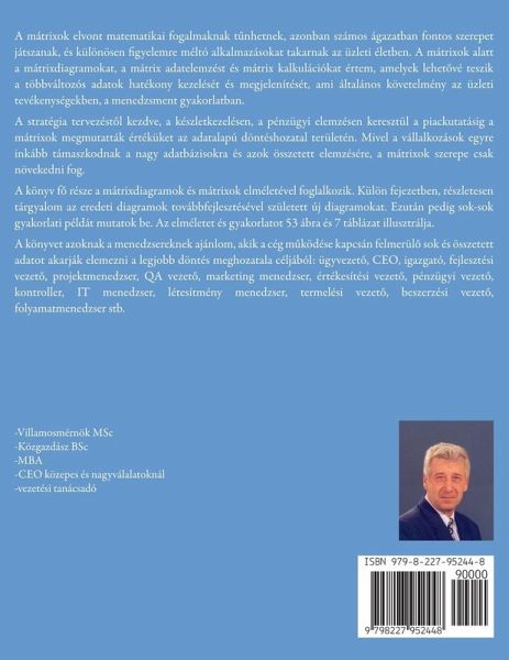 A mátrixok elvont matematikai fogalmaknak t¿nhetnek, azonban számos ágazatban fontos szerepet játszanak, és különösen figyelemre méltó alkalmazásokat takarnak az üzleti életben. A mátrixok alatt a mátrixdiagramokat, a mátrix adatelemzést és mátrix kalkulációkat értem, amelyek lehet¿vé teszik a többváltozós adatok hatékony kezelését és megjelenítését, ami általános követelmény az üzleti tevékenységekben, a menedzsment gyakorlatban. A stratégia tervezést¿l kezdve, a készletkezelésen, a pénzügyi elemzésen keresztül a piackutatásig a mátrixok megmutatták értéküket az adatalapú döntéshozatal területén. Mivel a vállalkozások egyre inkább támaszkodnak a nagy adatbázisokra és azok összetett elemzésére, a mátrixok szerepe csak növekedni fog. A könyv f¿ része a mátrixdiagramok és mátrixok elméletével foglalkozik. Külön fejezetben, részletesen tárgyalom az eredeti diagramok továbbfejlesztésével született új diagramokat. Ezután pedig sok-sok gyakorlati példát mutatok be. Az elméletet és gyakorlatot 53 ábra és 7 táblázat illusztrálja. A könyvet azoknak a menedzsereknek ajánlom, akik a cég m¿ködése kapcsán felmerül¿ sok és összetett adatot akarják elemezni a legjobb döntés meghozatala céljából: ügyvezet¿, CEO, igazgató, fejlesztési vezet¿, projektmenedzser, QA vezet¿, marketing menedzser, értékesítési vezet¿, pénzügyi vezet¿, kontroller, IT menedzser, létesítmény menedzser, termelési vezet¿, beszerzési vezet¿, folyamatmenedzser stb.