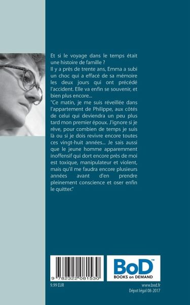 Et si le voyage dans le temps était une histoire de famille ?Il y a près de trente ans, Emma a subi un choc qui a effacé de sa mémoire les deux jours qui ont précédé l'accident. Elle va enfin se souvenir, et bien plus encore..."Ce matin, je me suis réveillée dans l'appartement de Philippe, aux côtés de celui qui deviendra un peu plus tard mon premier époux. J'ignore si je rêve, pour combien de temps je suis là ou si je dois revivre encore toutes ces vingt-huit années... Je sais aussi que le jeune homme apparemment inoffensif qui dort encore près de moi est toxique, manipulateur et violent, mais qu'il me faudra encore plusieurs années avant d'en prendre pleinement conscience et oser enfin le quitter."