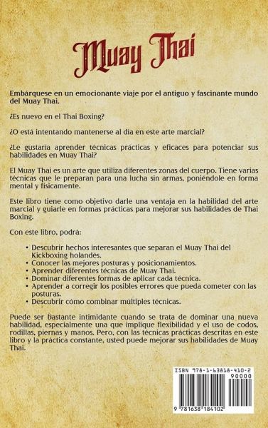Embárquese en un emocionante viaje por el antiguo y fascinante mundo del Muay Thai. ¿Es nuevo en el Thai Boxing? ¿O está intentando mantenerse al día en este arte marcial? ¿Le gustaría aprender técnicas prácticas y eficaces para potenciar sus habilidades en Muay Thai? El Muay Thai es un arte que utiliza diferentes zonas del cuerpo. Tiene varias técnicas que le preparan para una lucha sin armas, poniéndole en forma mental y físicamente. Este libro tiene como objetivo darle una ventaja en la habilidad del arte marcial y guiarle en formas prácticas para mejorar sus habilidades de Thai Boxing. Con este libro, podrá:Descubrir hechos interesantes que separan el Muay Thai del Kickboxing holandés. Conocer las mejores posturas y posicionamientos. Aprender diferentes técnicas de Muay Thai. Dominar diferentes formas de aplicar cada técnica. Aprender a corregir los posibles errores que pueda cometer con las posturas. Descubrir cómo combinar múltiples técnicas. Puede ser bastante intimidante cuando se trata de dominar una nueva habilidad, especialmente una que implique flexibilidad y el uso de codos, rodillas, piernas y manos. Pero, con las técnicas prácticas descritas en este libro y la práctica constante, usted puede mejorar sus habilidades de Muay Thai.