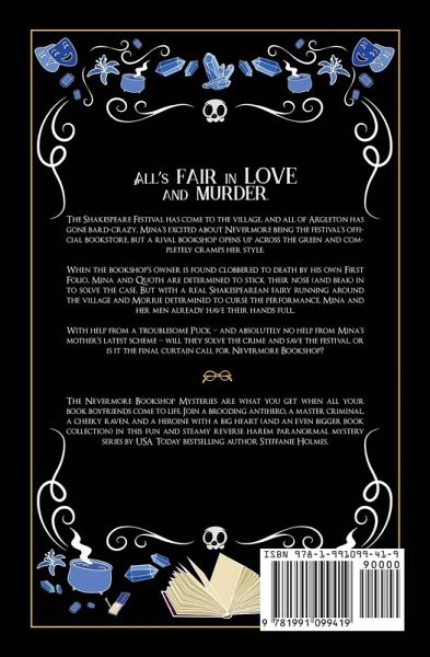 All's fair in love and murder. The Shakespeare Festival has come to the village, and all of Argleton has gone bard-crazy. Mina's excited about Nevermore being the festival's official bookstore, but a rival bookshop opens up across the green and completely cramps her style. When the bookshop's owner is found clobbered to death by his own First Folio, Mina and Quoth are determined to stick their nose (and beak) in to solve the case. But with a real Shakespearean fairy running around the village and Morrie determined to curse the performance, Mina and her men already have their hands full. With help from a troublesome Puck - and absolutely no help from Mina's mother's latest scheme - will they solve the crime and save the festival, or is it the final curtain call for Nevermore Bookshop? The Nevermore Bookshop Mysteries are what you get when all your book boyfriends come to life. Join a brooding antihero, a master criminal, a cheeky raven, and a heroine with a big heart (and an even bigger book collection) in this fun and steamy reverse harem paranormal mystery series by USA Today bestselling author Steffanie Holmes.