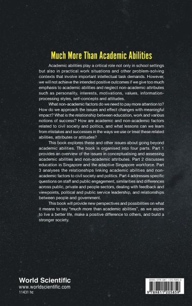 Academic abilities play a critical role not only in school settings but also in practical work situations and other problem-solving contexts that involve important intellectual task demands. However, we will not achieve the intended positive outcomes if we give too much emphasis to academic abilities and neglect non-academic attributes such as personality, interests, motivations, values, information-processing styles, self-concepts and attitudes. What non-academic factors do we need to pay more attention to? How do we approach the issues and effect changes with meaningful impact? What is the relationship between education, work and various notions of success? How are academic and non-academic factors related to civil society and politics, and what lessons can we learn from mistakes and successes in the ways we use or treat these related abilities, attributes or attitudes? This book explores these and other issues about going beyond academic abilities. The book is organised into four parts. Part 1 provides an overview of the issues in conceptualising and assessing academic abilities and non-academic attributes. Part 2 discusses education in Singapore and the adaptive Singapore workforce. Part 3 analyses the relationships linking academic abilities and non-academic factors to civil society and politics. Part 4 addresses specific questions on staff and public engagement, similarities and differences across public, private and people sectors, dealing with feedback and viewpoints, political and public service leadership, and relationships between people and government. This book will provide new perspectives and possibilities on what it means to say "much more than academic abilities", as we aspire to live a better life, make a positive difference to others, and build a stronger society.