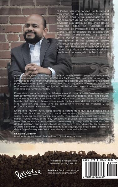 A pesar de los años transcurridos todavía se mantiene fresco en mi memoria, aquel joven que acababa de llegar de México a California EUA, que visitó unas de mis campañas de avivamiento. Con pocas palabras, destilaba una mudurez y una unción poco usual para un joven de 17 años de edad. En aquel entonces no sabíamos los profundos lazos de amistad que ligarían nuestras vidas en la preciosa tarea del santo evangelio que fuimos llamados. Pocos años más tarde, a ese fiel Alfarero le plació tomar a Isaías Fernández en sus tiernas y firmes manos para utilizarlo como un vaso muy especial en el reino de Dios. Los Dones que el Espíritu Santo le ha dotado, son muchos; Pastor, Evangelista, Maestro, Salmista, etc. Pero el don que más me ha sorprendido, es el conocimiento y revelación que Isaías tiene de compartir y enseñar los misterios y las profundidades de la Palabra de Dios. En su libro "Mucho Fruto", Isaías levanta la cortina de lo que es el proceso de la semilla, siembre, cosecha y fruto, usando como ejemplo las etapas de la vida de Jesús, desde su muerte hasta su exaltación. Enfatizando sobre todo que no puede haber Muchos Fruto, si no hay embates y pruebas en la vida del creyente. Recomiendo calurosamente este libro de mi amigo y colega Isaías Fernández. Creo de corazón, que es un vehículo de sabiduría y entendimiento divino que le ayudará a acelerar su crecimiento espiritual, para que pueda llegar hasta la estatura del varón perfecto que es Jesucristo, el mayor de todos los frutos. Dr. David Calderón Presidente del Ministerio Evangelistero Global Internacional.