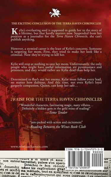 The exciting conclusion of the Terra Haven Chronicles! Kylie's everlasting seed is supposed to guide her to the story of a lifetime, but that hardly matters now. Suspended from her position as a journalist for the Terra Haven Chronicle, she can't publish anything. However, a stymied career is the least of Kylie's concerns. Someone is targeting her mom. First, they tried to make her look like a criminal. Now they're trying to kill her. Kylie will stop at nothing to save her mom. Unfortunately, the only people who might have useful information are pyromaniacs and prisoners, and they would rather see Kylie dead than help her. Determined to flush out her enemy, Kylie must follow every lead, no matter how dubious. And this time, not even Kylie's loyal gargoyle companion, Quinn, can keep her safe... Pick up your copy of this action-packed fantasy today! READING ORDER TERRA HAVEN CHRONICLES Deadlines & Dryads (prequel) Leads & Lynxes Headlines & Hydras Muckrakers & Minotaurs OTHER NOVELS IN THIS WORLD -Gargoyle Guardian Chronicles- Magic of the Gargoyles Curse of the Gargoyles Secret of the Gargoyles Lured (a newsletter-exclusive novella)