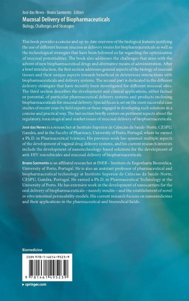 Concepts in Mucosal Immunity and Mucosal Vaccines.- Mucoadhesion and Characterization of Mucoadhesive Properties.- Mucus as a Barrier for Biopharmaceuticals and Drug Delivery Systems.- Epithelial Permeation and Absorption Mechanisms of Biopharmaceuticals.- Oral Delivery of Biopharmaceuticals.- Buccal Delivery of Biopharmaceuticals: Vaccines and Allergens.- Pulmonary Delivery of Biopharmaceuticals.- Nasal Delivery of Biopharmaceuticals.- Ocular Delivery of Biopharmaceuticals.- Vaginal Delivery of Biopharmaceuticals.- Nanoparticles-in-Microsphere Oral Delivery Systems (NiMOS) for Nucleic Acid Therapy in the Gastrointestinal Tract.- Bacteria-Based Vectors for Oral Gene Therapy.- Self-Assembled Polysaccharide Nanogels for Nasal Delivery of Biopharmaceuticals.- Pheroid(TM) Vesicles and Microsponges for Nasal Delivery of Biopharmaceuticals.- Delivery Strategies for Developing siRNA-Based Vaginal Microbicides.- Delivery Strategies for Developing Vaginal DNA Vaccine Combining Cell-Penetrating Peptides and Jet Injection.- Vaccine Delivery Systems for Veterinary Immunization.- Eligen® Technology for Oral Delivery of Proteins and Peptides.- The RapidMist(TM) System for Buccal Delivery of Insulin.- The Pharmaceutical Development of rhDNase (Dornase Alpha) for the Treatment of Cystic Fibrosis.- Development of the Exubera® Insulin Pulmonary Delivery System.- Technosphere®: An Inhalation System for Pulmonary Delivery of Biopharmaceuticals.- ChiSys® as a Chitosan-Based Delivery Platform for Nasal Vaccination.- Development of a Cationic Nanoemulsion Platform (Novasorb®) for Ocular Delivery.- Regulatory Aspects and Approval of Biopharmaceuticals for Mucosal Delivery: Quality, Toxicology and Clinical Aspects.