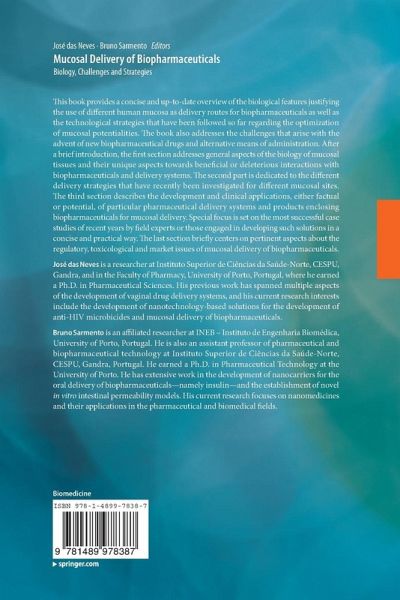 Concepts in Mucosal Immunity and Mucosal Vaccines.- Mucoadhesion and Characterization of Mucoadhesive Properties.- Mucus as a Barrier for Biopharmaceuticals and Drug Delivery Systems.- Epithelial Permeation and Absorption Mechanisms of Biopharmaceuticals.- Oral Delivery of Biopharmaceuticals.- Buccal Delivery of Biopharmaceuticals: Vaccines and Allergens.- Pulmonary Delivery of Biopharmaceuticals.- Nasal Delivery of Biopharmaceuticals.- Ocular Delivery of Biopharmaceuticals.- Vaginal Delivery of Biopharmaceuticals.- Nanoparticles-in-Microsphere Oral Delivery Systems (NiMOS) for Nucleic Acid Therapy in the Gastrointestinal Tract.- Bacteria-Based Vectors for Oral Gene Therapy.- Self-Assembled Polysaccharide Nanogels for Nasal Delivery of Biopharmaceuticals.- Pheroid(TM) Vesicles and Microsponges for Nasal Delivery of Biopharmaceuticals.- Delivery Strategies for Developing siRNA-Based Vaginal Microbicides.- Delivery Strategies for Developing Vaginal DNA Vaccine Combining Cell-Penetrating Peptides and Jet Injection.- Vaccine Delivery Systems for Veterinary Immunization.- Eligen® Technology for Oral Delivery of Proteins and Peptides.- The RapidMist(TM) System for Buccal Delivery of Insulin.- The Pharmaceutical Development of rhDNase (Dornase Alpha) for the Treatment of Cystic Fibrosis.- Development of the Exubera® Insulin Pulmonary Delivery System.- Technosphere®: An Inhalation System for Pulmonary Delivery of Biopharmaceuticals.- ChiSys® as a Chitosan-Based Delivery Platform for Nasal Vaccination.- Development of a Cationic Nanoemulsion Platform (Novasorb®) for Ocular Delivery.- Regulatory Aspects and Approval of Biopharmaceuticals for Mucosal Delivery: Quality, Toxicology and Clinical Aspects.