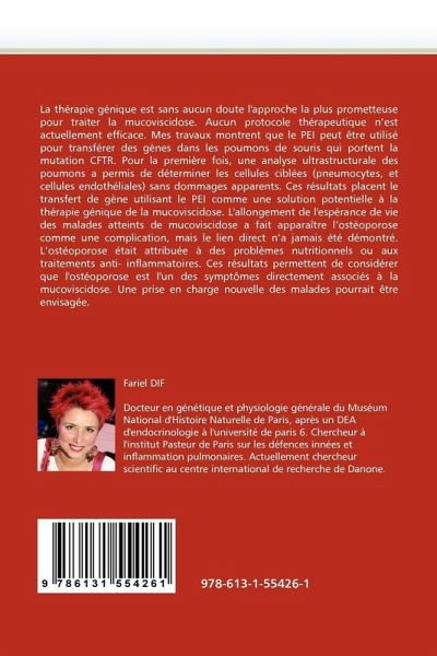 La thérapie génique est sans aucun doute l'approche la plus prometteuse pour traiter la mucoviscidose. Aucun protocole thérapeutique n'est actuellement efficace. Mes travaux montrent que le PEI peut être utilisé pour transférer des gènes dans les poumons de souris qui portent la mutation CFTR. Pour la première fois, une analyse ultrastructurale des poumons a permis de déterminer les cellules ciblées (pneumocytes, et cellules endothéliales) sans dommages apparents. Ces résultats placent le transfert de gène utilisant le PEI comme une solution potentielle à la thérapie génique de la mucoviscidose. L'allongement de l'espérance de vie des malades atteints de mucoviscidose a fait apparaître l'ostéoporose comme une complication, mais le lien direct n'a jamais été démontré. L'ostéoporose était attribuée à des problèmes nutritionnels ou aux traitements anti- inflammatoires. Ces résultats permettent de considérer que l'ostéoporose est l'un des symptômes directement associés à la mucoviscidose. Une prise en charge nouvelle des malades pourrait être envisagée.
