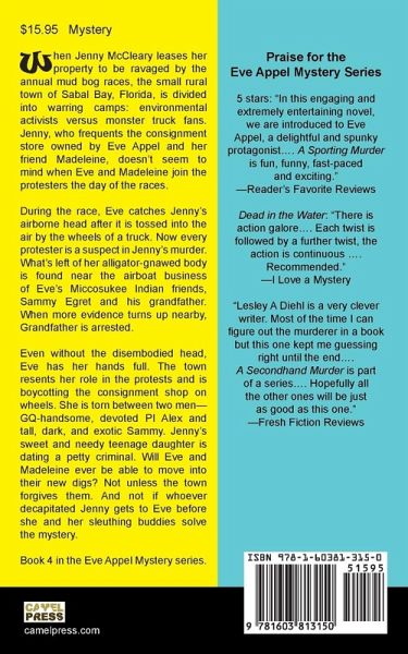 When Jenny McCleary leases her property to be ravaged by the annual mud bog races, the small rural town of Sabal Bay, Florida, is divided into warring camps: environmental activists versus monster truck fans. Jenny, who frequents the consignment store owned by Eve Appel and her friend Madeleine, doesn't seem to mind when Eve and Madeleine join the protesters the day of the races. During the race, Eve catches Jenny's airborne head after it is tossed into the air by the wheels of a truck. Now every protester is a suspect in Jenny's murder. What's left of her alligator-gnawed body is found near the airboat business of Eve's Miccosukee Indian friends, Sammy Egret and his grandfather. When more evidence turns up nearby, Grandfather is arrested. Even without the disembodied head, Eve has her hands full. The town resents her role in the protests and is boycotting the consignment shop on wheels. She is torn between two men GQ-handsome, devoted PI Alex and tall, dark, and exotic Sammy. Jenny's sweet and needy teenage daughter is dating a petty criminal. Will Eve and Madeleine ever be able to move into their new digs? Not unless the town forgives them. And not if whoever decapitated Jenny gets to Eve before she and her sleuthing buddies solve the mystery. Book 4 in the Eve Appel Mystery series.