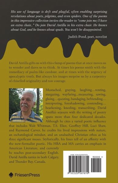 Mustached, graying, laughing...tenting, stargazing, wayfaring...measuring, sawing, gluing...questing, bandaging, befriending...interpreting, foreshadowing, contending...hearkening, kneeling, transcribing. David Antilla's sojourn with the writing of poetry spans more than four dedicated decades. Although he cites a varied poetic influence that includes Walt Whitman, T.S. Eliot, Geoffrey Hill, Luci Shaw, and Raymond Carver, he credits his lived impressions with nature, an eschatological mindset, and an unabashed Christian ethos as his three significant muses. Stylistically, his lines tell of an affinity with the new-formalist poetic. His HBA and MA carries an emphasis in American Literature, and currently he teaches post-secondary English. David Antilla tarries in both Calgary, and Thunder Bay, Canada.