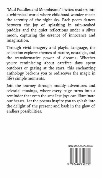 "Mud Puddles and Moonbeams" invites readers into a whimsical world where childhood wonder meets the serenity of the night sky. Each poem dances between the joy of splashing in rain-soaked puddles and the quiet reflections under a silver moon, capturing the essence of innocence and imagination. Through vivid imagery and playful language, the collection explores themes of nature, nostalgia, and the transformative power of dreams. Whether you're reminiscing about carefree days spent outdoors or gazing at the stars, this enchanting anthology beckons you to rediscover the magic in life's simple moments. Join the journey through muddy adventures and celestial musings, where every page turns into a reminder that even the smallest joys can illuminate our hearts. Let the poems inspire you to splash into the delight of the present and bask in the glow of endless possibilities.