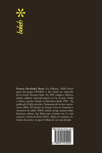 Ernesto Hernández Busto (La Habana, 1968) formó parte del grupo PAIDEIA y del comité de redacción de la revista Naranja Dulce. En 1991 emigró a México, donde colaboró sistemáticamente en las revistas Vuelta y Poesía y poética. Reside en Barcelona desde 1999. Ha publicado Perfiles derechos. Fisonomías del escritor reaccionario (2004, III Premio de Ensayo Casa de América) e Inventario de saldos (2005), donde recoge ensayos sobre literatura cubana. Sus libros más recientes son La ruta natural y Diario de Kioto (2015). Muda es su primer volumen de poesía y recoge el trabajo de casi una década.
