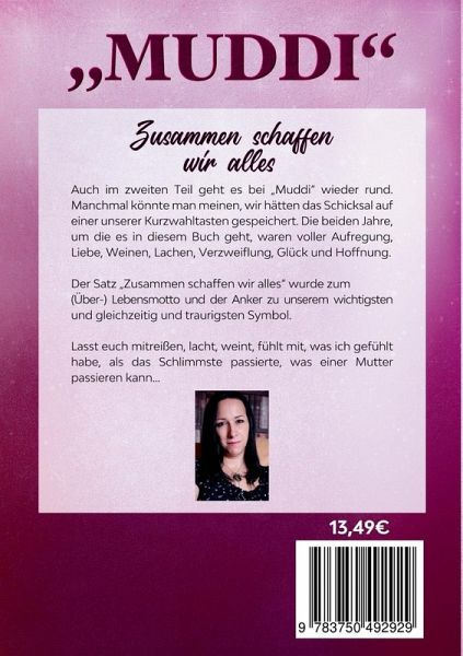 Auch im zweiten Teil geht es bei Muddi wieder hoch her. Manchmal könnte man meinen, wir hätten das Schicksal auf eine der Kurzwahltasten. Die zwei Jahre, um die es in diesem Buch geht, waren voller Aufregung, Liebe, Weinen, Lachen, Verzweiflung, Glück und Hoffnung. Der Satz Zusammen schaffen wir alles wurde zum (Über-) Lebensmotto, der Anker zu unserem wichtigsten und gleichzeitig traurigsten Symbol. Laßt Euch mitreißen, lacht, weint, fühlt mit, was ich gefühlt habe, als mir das Schlimmste passiert ist, was einer Mutter passieren kann... Es ist der zweite Teil einer Geschichte über fünf Menschen, die immer zusammen gehalten haben.
