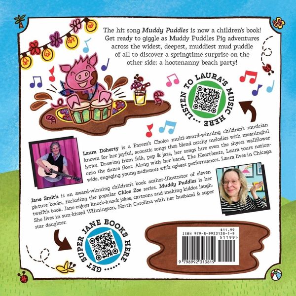 Laura Doherty's hit song "Muddy Puddles" is now a children's book! Get ready to giggle as Muddy Puddles the Pig adventures across the widest, deepest, muddiest mud puddle of all to discover a springtime surprise on the other side: a hootenanny beach party! Muddy Puddles' farm animal friends play musical instruments such as the banjo, fiddle, upright bass, harmonica and guitar. This 24 page book also includes sheet music for the chorus of the song, and includes a QR code that takes readers to a link to download or stream the Muddy Puddles song. The book also includes "Move to the song" page, outlining activities that children can do while reading the book and listening to the song.