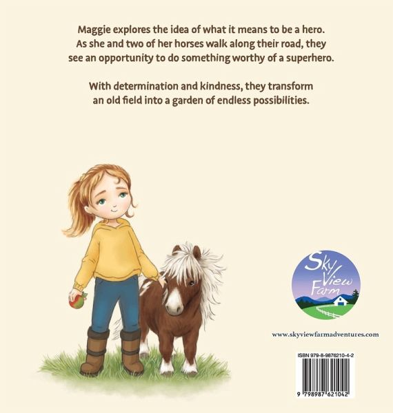 Maggie explores the idea of what it means to be a hero. As she and two of her horses walk along their road, they see an opportunity to do something worthy of a superhero. With determination and kindness, they transform an old field into a garden of endless possibilities.
