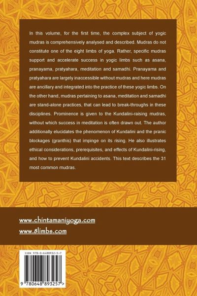 In this volume, for the first time, the complex subject of yogic mudras is comprehensively analysed and described. Mudras do not constitute one of the eight limbs of yoga. Rather, specific mudras support and accelerate success in yogic limbs such as asana, pranayama, pratyahara, meditation and samadhi. Pranayama and pratyahara are largely inaccessible without mudras and here mudras are ancillary and integrated into the practice of these yogic limbs. On the other hand, mudras pertaining to asana, meditation and samadhi are stand-alone practices, that can lead to break-throughs in these disciplines. Prominence is given to the Kundalini-raising mudras, without which success in meditation is often drawn out. The author additionally elucidates the phenomenon of Kundalini and the pranic blockages (granthis) that impinge on its rising. He also illustrates ethical considerations, prerequisites, and effects of Kundalini-rising, and how to prevent Kundalini accidents. This text describes the 31 most common mudras.