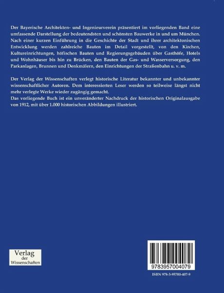 Der Bayerische Architekten- und Ingenieurverein präsentiert im vorliegenden Band eine umfassende Darstellung der bedeutendsten und schönsten Bauwerke in und um München. Nach einer kurzen Einführung in die Geschichte der Stadt und ihrer architektonischen Entwicklung werden zahlreiche Bauten im Detail vorgestellt, von den Kirchen, Kultureinrichtungen, höfischen Bauten und Regierungsgebäuden über Gasthöfe, Hotels und Wohnhäuser bis hin zu Brücken, den Bauten der Gas- und Wasserversorgung, den Parkanlagen, Brunnen und Denkmälern, den Einrichtungen der Straßenbahn u. v. m.