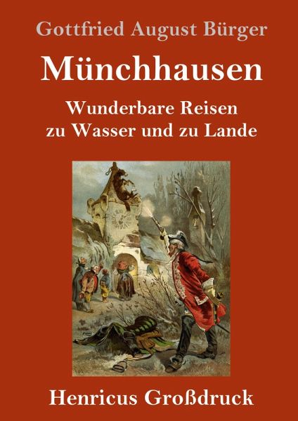 Gottfried August Bürger: Münchhausen. Wunderbare Reisen zu Wasser und zu Lande Feldzüge und lustige Abenteuer des Freiherrn von Münchhausen, wie er dieselben bei der Flasche im Zirkel seiner Freunde selbst zu erzählen pflegt Lesefreundlicher Großdruck in 16-pt-Schrift Großformat, 210 x 297 mm Berliner Ausgabe, 2019 Durchgesehener Neusatz mit einer Biographie des Autors bearbeitet und eingerichtet von Theodor Borken Erstdruck: London [recte: Göttingen] 1786. Textgrundlage ist die Ausgabe: Gottfried August Bürger: Wunderbare Reisen zu Wasser und zu Lande. Feldzüge und lustige Abenteuer des Freiherrn von Münchhausen, wie er dieselben bei der Flasche im Zirkel seiner Freunde selbst zu erzählen pflegt. Frankfurt a.M.: Insel, 1976. Umschlaggestaltung von Thomas Schultz-Overhage unter Verwendung des Bildes: Gottfried Franz, Münchhausen, 1896. Gesetzt aus der Minion Pro, 16 pt.