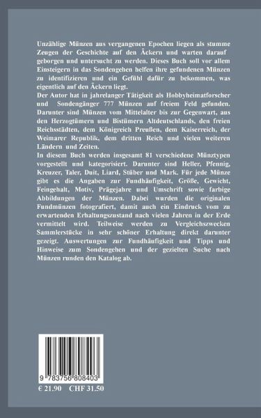 Unzählige Münzen aus vergangenen Epochen liegen als stumme Zeugen der Geschichte auf den Äckern und warten darauf geborgen und untersucht zu werden. Dieses Buch soll vor allem Einsteigern in das Sondengehen helfen ihre gefundenen Münzen zu identifizieren und ein Gefühl dafür zu bekommen, was eigentlich auf den Äckern liegt. Der Autor hat in jahrelanger Tätigkeit als Hobbyheimatforscher und Sondengänger 777 Münzen auf freiem Feld gefunden. Darunter sind Münzen vom Mittelalter bis zur Gegenwart, aus den Herzogtümern und Bistümern Altdeutschlands, den freien Reichsstädten, dem Königreich Preußen, dem Kaiserreich, der Weimarer Republik, dem dritten Reich und vielen weiteren Ländern und Zeiten. In diesem Buch werden insgesamt 81 verschiedene Münztypen vorgestellt und kategorisiert. Darunter sind Heller, Pfennig, Kreuzer, Taler, Duit, Liard, Stüber und Mark. Für jede Münze gibt es die Angaben zur Fundhäufigkeit, Größe, Gewicht, Feingehalt, Motiv, Prägejahre und Umschrift sowie farbige Abbildungen der Münzen. Dabei wurden die originalen Fundmünzen fotografiert, damit auch ein Eindruck vom zu erwartenden Erhaltungszustand nach vielen Jahren in der Erde vermittelt wird. Teilweise werden zu Vergleichszwecken Sammlerstücke in sehr schöner Erhaltung direkt darunter gezeigt. Auswertungen zur Fundhäufigkeit und Tipps und Hinweise zum Sondengehen und der gezielten Suche nach Münzen runden den Katalog ab. Der Tätigkeitsschwerpunkt des Autors, und damit der hier vorgestellten Münzen, liegt am Niederrhein, in anderen Gegend sind natürlich auch andere Münzen und Münzverteilungen zu erwarten. Der Tätigkeitsschwerpunkt des Autors, und damit der hier vorgestellten Münzen, liegt am Niederrhein, in anderen Gegend sind natürlich auch andere Münzen und Münzverteilungen zu erwarten.