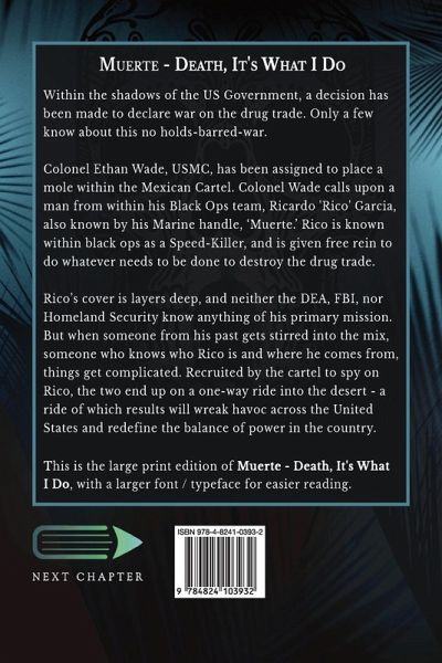 Within the shadows of the US Government, a decision has been made to declare war on the drug trade. Only a few know about this no holds-barred-war. Colonel Ethan Wade, USMC, has been assigned to place a mole within the Mexican Cartel. Colonel Wade calls upon a man from within his Black Ops team, Ricardo 'Rico' Garcia, also known by his Marine handle, 'Muerte.' Rico is known within black ops as a Speed-Killer, and is given free rein to do whatever needs to be done to destroy the drug trade. Rico's cover is layers deep, and neither the DEA, FBI, nor Homeland Security know anything of his primary mission. But when someone from his past gets stirred into the mix, someone who knows who Rico is and where he comes from, things get complicated. Recruited by the cartel to spy on Rico, the two end up on a one-way ride into the desert - a ride of which results will wreak havoc across the United States and redefine the balance of power in the country. This is the large print edition of Muerte - Death, It's What I Do, with a larger font / typeface for easier reading.