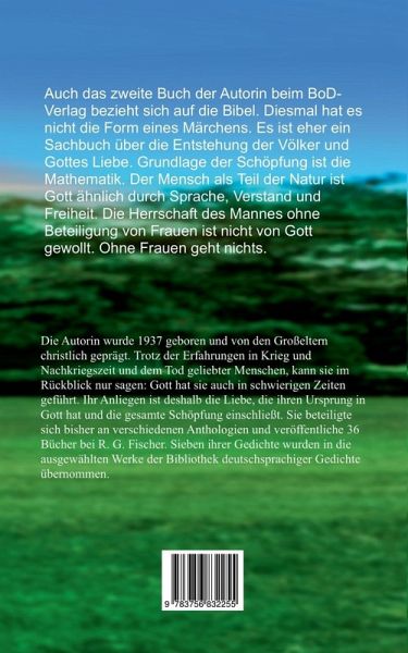 Auch das zweite Buch der Autorin beim BoD-Verlag bezieht sich auf die Bibel. Diesmal hat es nicht die Form eines Märchens. Es ist eher ein Sachbuch über die Entstehung der Völker und Gottes Liebe. Grundlage der Schöpfung ist die Mathematik. Der Mensch als Teil der Natur ist Gott ähnlich durch Sprache, Verstand und Freiheit. Die Herrschaft des Mannes ohne Beteiligung von Frauen ist nicht von Gott gewollt. Ohne Frauen geht nichts.