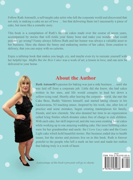 Follow Ruth Antonelli, a self-taught cake artist who left the corporate world and discovered that not only is making a cake an act of love but that delivering them wasn't a piece of cake but rather a comedic story. This book is a compilation of Ruth's favorite cakes made over the course of seven years, accompanied by stories that will tickle your funny bone and make you wonder what could possibly go wrong? Funny always follows Ruth and her comedic humor was a valuable asset to her business. She shares the funny and endearing stories of her cakes, from creation to delivery, that you can enjoy with no calories. Enjoy a tabletop book that makes you laugh, cry, and maybe even try to recreate yourself with her helpful tips. Muffin But the Best Cakes was a work of art, a lesson in love, and can now be delivered to your home.