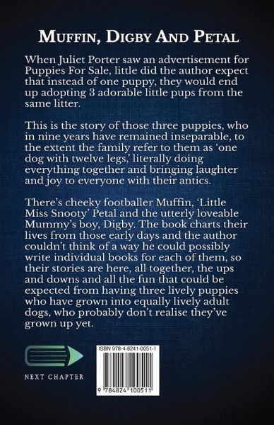 When Juliet Porter saw an advertisement for Puppies For Sale, little did the author expect that instead of one puppy, they would end up adopting 3 adorable little pups from the same litter. This is the story of those three puppies, who in nine years have remained inseparable, to the extent the family refer to them as 'one dog with twelve legs,' literally doing everything together and bringing laughter and joy to everyone with their antics. There's cheeky footballer Muffin, 'Little Miss Snooty' Petal and the utterly loveable Mummy's boy, Digby. The book charts their lives from those early days and the author couldn't think of a way he could possibly write individual books for each of them, so their stories are here, all together, the ups and downs and all the fun that could be expected from having three lively puppies who have grown into equally lively adult dogs, who probably don't realise they've grown up yet.