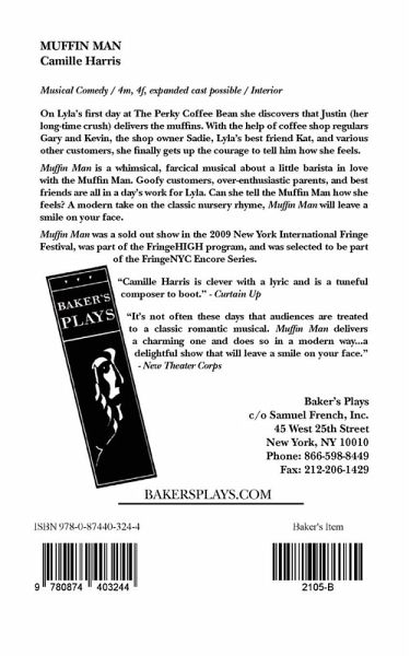 Musical Comedy Characters: 4 male, 4 female, expanded cast possible Interior On Lyla's first day at The Perky Coffee Bean she discovers that Justin (her long-time crush) delivers the muffins. With the help of coffee shop regulars Gary and Kevin, the shop owner Sadie, Lyla's best friend Kat, and various other customers, she finally gets up the courage to tell him how she feels. Muffin Man is a whimsical, farcical musical about a little barista in love with the Muffin Man. Goofy customers, over-enthusiastic parents, and best friends are all in a day's work for Lyla. Can she tell the Muffin Man how she feels? A modern take on the classic nursery rhyme, Muffin Man will leave a smile on your face. Muffin Man was a sold out show in the 2009 New York International Fringe Festival, was part of the FringeHIGH program, and was selected to be part of the FringeNYC Encore Series. "Camille Harris is clever with a lyric and is a tuneful composer to boot." - Curtain Up "It's not often these days that audiences are treated to a classic romantic musical. Muffin Man delivers a charming one and does so in a modern way...a delightful show that will leave a smile on your face." - New Theater Corps