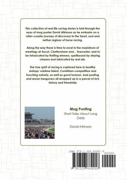This collection of real-life racing stories is told through the eyes of mug punter David Atkinson as he embarks on a roller-coaster journey of discovery to the heart, soul and nether regions of horse racing. Along the way there is time to revel in the maelstrom of meetings at Cheltenham, Ascot and.....Towcester; and by turns be intoxicated by thrilling winners, spellbound by staying chasers and lubricated by real ale. The true spirit of racing is captured here in healthy dollops: sublime talent, Corinthian competition and touching naivety, as well as good humour, bad punting and worse hangovers all wrapped up in a parcel of rich history and friendship.