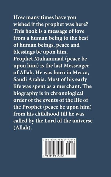 How many times have you wished if the prophet was here? This book is a message of love from a human being to the best of human beings, peace and blessings be upon him. Prophet Muhammad (peace be upon him) is the last Messenger of Allah (God). He was born in Mecca, Saudi Arabia. Most of his early life was spent as a merchant. The biography is in chronological order of the events of the life of the Prophet (peace be upon him) from his childhood till he was called by the Lord of the universe (Allah).