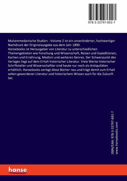 Muhammedanische Studien - Volume 2 ist ein unveränderter, hochwertiger Nachdruck der Originalausgabe aus dem Jahr 1890.Hansebooks ist Herausgeber von Literatur zu unterschiedlichen Themengebieten wie Forschung und Wissenschaft, Reisen und Expeditionen, Kochen und Ernährung, Medizin und weiteren Genres. Der Schwerpunkt des Verlages liegt auf dem Erhalt historischer Literatur. Viele Werke historischer Schriftsteller und Wissenschaftler sind heute nur noch als Antiquitäten erhältlich. Hansebooks verlegt diese Bücher neu und trägt damit zum Erhalt selten gewordener Literatur und historischem Wissen auch für die Zukunft bei.