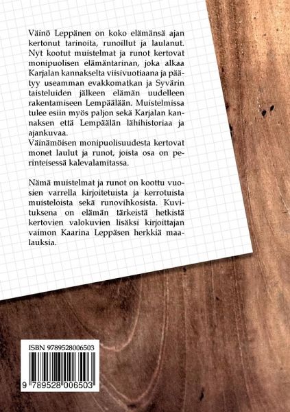 Väinö Leppänen on koko elämänsä ajan kertonut tarinoita, runoillut ja laulanut. Nyt kootut muistelmat ja runot kertovat monipuolisen elämäntarinan, joka alkaa Karjalan kannakselta viisivuotiaana ja päätyy useamman evakkomatkan ja Syvärin taisteluiden jälkeen elämän uudelleen rakentamiseen Lempäälään. Muistelmissa tulee esiin myös paljon sekä Karjalan kannaksen että Lempäälän lähihistoriaa ja ajankuvaa. Väinämöisen monipuolisuudesta kertovat monet laulut ja runot, joista osa on perinteisessä kalevalamitassa. Nämä muistelmat ja runot on koottu vuosien varrella kirjoitetuista ja kerrotuista muisteloista sekä runovihkosista. Kuvituksena on elämän tärkeistä hetkistä kertovien valokuvien lisäksi kirjoittajan vaimon, Kaarina Leppäsen herkkiä maalauksia.