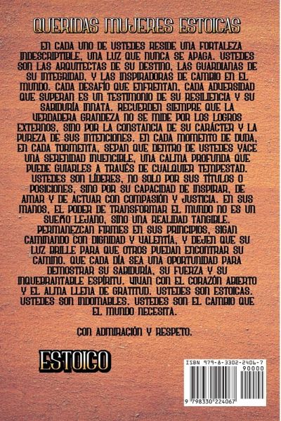 Queridas mujeres estoicas: En cada uno de ustedes reside una fortaleza indescriptible, una luz que nunca se apaga. Ustedes son las arquitectas de su destino, las guardianas de su integridad, y las inspiradoras de cambio en el mundo. Cada desafío que enfrentan, cada adversidad que superan, es un testimonio de su resiliencia y su sabiduría innata. Recuerden siempre que la verdadera grandeza no se mide por los logros externos, sino por la constancia de su carácter y la pureza de sus intenciones. En cada momento de duda, en cada tormenta, sepan que dentro de ustedes yace una serenidad invencible, una calma profunda que puede guiarles a través de cualquier tempestad. Ustedes son líderes, no solo por sus títulos o posiciones, sino por su capacidad de inspirar, de amar y de actuar con compasión y justicia. En sus manos, el poder de transformar el mundo no es un sueño lejano, sino una realidad tangible. Permanezcan firmes en sus principios, sigan caminando con dignidad y valentía, y dejen que su luz brille para que otros puedan encontrar su camino. Que cada día sea una oportunidad para demostrar su sabiduría, su fuerza y su inquebrantable espíritu. Vivan con el corazón abierto y el alma llena de gratitud. Ustedes son estoicas. Ustedes son indomables. Ustedes son el cambio que el mundo necesita. Con admiración y respeto.