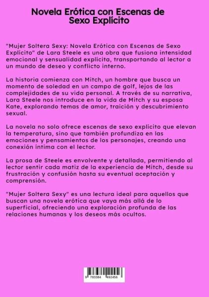 "Mujer Soltera Sexy: Novela Erótica con Escenas de Sexo Explícito" de Lara Steele es una obra que fusiona intensidad emocional y sensualidad explícita, transportando al lector a un mundo de deseo y conflicto interno. La historia comienza con Mitch, un hombre que busca un momento de soledad en un campo de golf, lejos de las complejidades de su vida personal. A través de su narrativa, Lara Steele nos introduce en la vida de Mitch y su esposa Kate, explorando temas de amor, traición y descubrimiento sexual. La novela no solo ofrece escenas de sexo explícito que elevan la temperatura, sino que también profundiza en las emociones y pensamientos de los personajes, creando una conexión íntima con el lector. La prosa de Steele es envolvente y detallada, permitiendo al lector sentir cada matiz de la experiencia de Mitch, desde su frustración y confusión hasta su eventual aceptación y comprensión."Mujer Soltera Sexy" es una lectura ideal para aquellos que buscan una novela erótica que vayamás allá de lo superficial, ofreciendo una exploración profunda de las relaciones humanas y los deseos más ocultos.