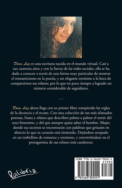 Dora Luz ahora llega con su primer libro rompiendo las reglas de la decencia y el recato. Con una colección de sus más afamados poemas, frases y relatos que describen palmo a palmo el sentir del sexo femenino, y del que siempre quiso saber el hombre. Mujer, donde tus secretos se encontrarán con palabras que gritarán en silencio lo que tu corazón está sintiendo. Dejándote atrapado en un torbellino de romance y erotismo, y convirtiéndote en el protagonista de sus relatos más candentes.