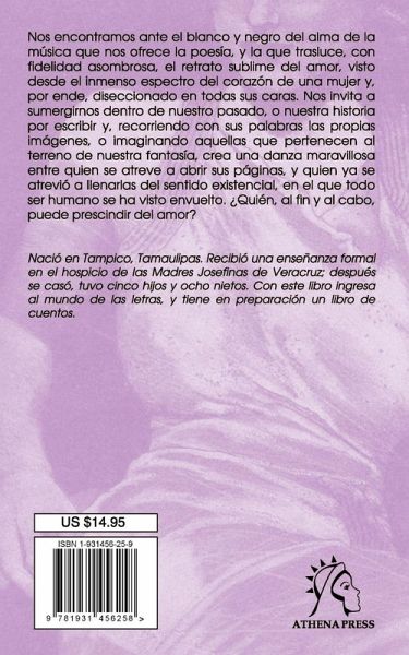 We find ourselves in the presence of the black and white soul of music that poetry offers us, which reveals, with astonishing truthfulness, love's sublime portrait, viewed from the broad spectrum of a woman's heart, consequently, dissected in all its apects. It invites us to submerge ourselves inside our own past, or our own history yet to be written and, traveling through the images with her words, or imagining those that belong to our own fantasy land, a wonderful dance is created between those who dare to open its pages and those who fill them with an existential sense that every human being has experienced. In the final analysis, which of us can survive without love?