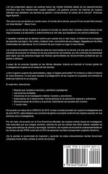 ¿Te has preguntado alguna vez quiénes fueron las mentes brillantes detrás de los descubrimientos científicos que han transformado nuestra realidad? ¿Te gustaría conocer las historias de mujeres valientes que desafiaron las barreras de género y revolucionaron el campo de la ciencia? Entonces sigue leyendo... "Era como si se me abriera un mundo nuevo, el mundo de la ciencia, que por fin se me permitía conocer con toda libertad." - Marie Curie La incorporación de las mujeres a la ciencia no ha sido un camino fácil. Durante mucho tiempo se les negó el acceso a la educación y anteriormente era mal visto que estudiaran una carrera profesional. Y aquellas mujeres que se abrieron camino aun cuando era un reto mayor, la historia se ha encargado de esconder sus logros. Han vivido, y todavía viven, a la sombra de sus colegas, relegadas por las élites intelectuales de cada época. Es el momento de que ocupen su lugar en esa historia. Las mujeres encuentran más obstáculos para ser reconocidas en la ciencia, a la vez que se enfrentan a prácticas de exclusión en ámbitos en los que predominan los hombres; por ello continúan las demandas para lograr que las personas tengan las mismas oportunidades de reconocimiento profesional por su talento y esfuerzo. A pesar de los avances logrados en las últimas décadas, todavía es reducido el número global de investigadoras mujeres en el campo de las ciencias. ¿Cómo lograron superar las adversidades y dejar un legado perdurable? Te invitamos a releer la historia en clave femenina, no solo para rescatar el protagonismo de las mujeres en el pasado sino también la dinámica histórica en su conjunto. En este libro, descubrirás: Mujeres que rompieron barreras y cambiaron paradigmas. Las pioneras olvidadas. Visionarias en la investigación médica: Curando y previniendo. Exploradoras de lo desconocido: Aventurándose en la exploración espacial y submarina. Revolucionarias de la física y la química: Descifrando los secretos del universo. Y mucho más... ¡No te pierdas la oportunidad de inspirarte y aprender de estas extraordinarias mentes femeninas! ¡Desplaza hacia arriba y añade al carrito de compra!