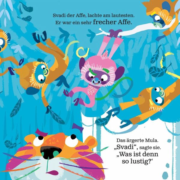Nachdem die kleine Fliege der verschlafenen Tigerin Mula geholfen hat, wach zu werden und neue Energie zu tanken, sind sie nun zurück, um Svadi, einem sehr eingebildeten Affen, dabei zu helfen, sich weniger darum zu sorgen, was andere von ihm denken! Svadi ist ein ziemlich frecher Affe. Er möchte immer etwas Besseres sein als die anderen. Er ist schließlich perfekt und keiner darf ihn auslachen.Doch sobald er den Dschungelrhythmus hört, macht sich Svadi keine Sorgen mehr über sein Aussehen. Er ist bereit, seine Hüften zu schwingen und das Lied seines Herzens zu singen."Mula und der freche Affe" ist mehr als nur ein Kinderbuch. Kinder werden das bunte Tigermädchen und die witzige Fliege lieben. Dabei lernen sie auf leichte und spielerische Art wichtige Werte kennen und sich in Bewegung zu bringen.