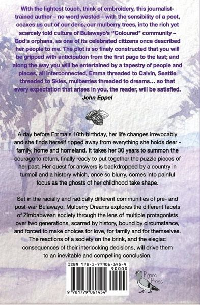 A day before Emma's 10th birthday, her life changes irrevocably and she finds herself ripped away from everything she holds dear - family, home and homeland. It takes her 30 years to summon the courage to return, finally ready to put together the puzzle pieces of her past. Her quest for answers is backdropped by a country in turmoil and a history which, once so blurry, comes into painful focus as the ghosts of her childhood take shape. Set in the racially and radically different communities of pre- and post-war Bulawayo, Mulberry Dreams explores the different facets of Zimbabwean society through the lens of multiple protagonists over two generations, scarred by history, bound by circumstance, and forced to make choices for love, for family and for themselves. The reactions of a society on the brink, and the elegiac consequences of their interlocking decisions, will drive them to an inevitable and compelling conclusion.