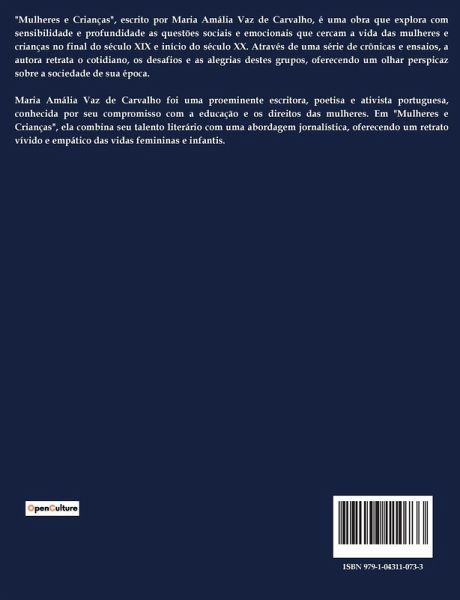 No livro "Mulheres e creanças: notas sobre educação", Maria Amália Vaz de Carvalho aborda a educação feminina e o papel das mulheres na sociedade. A autora critica a desigualdade intelectual entre os sexos, que resulta em desarmonia no lar e na sociedade. Ela argumenta que a educação das mulheres deve ser transformada para que possam ser verdadeiras companheiras e colaboradoras dos homens na construção de um futuro melhor. Vaz de Carvalho destaca a importância de uma educação sólida e prática, que vá além das futilidades e superficialidades, como a dança e a tapeçaria, e que inclua o estudo sério de música, línguas, história e ciências. A autora também critica o falso luxo e a vida de aparências que muitas mulheres buscam, o que leva a sacrifícios desnecessários e à corrupção dos valores familiares. Ela defende que a mulher deve encontrar satisfação e realização no ambiente doméstico, cultivando interesses intelectuais e artísticos que enriqueçam sua vida e a de sua família. Vaz de Carvalho conclui que, ao adotar uma nova abordagem educacional, as mulheres podem contribuir significativamente para a moralidade e a estabilidade da família e da sociedade.