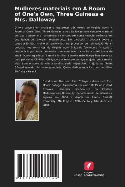O livro tentará ler, analisar e interpretar três textos de Virginia Woolf: A Room of One's Own, Three Guineas e Mrs Dalloway num contexto material em que o poder e a resistência se encontram numa relação dinâmica em que quase se reforçam mutuamente. Em particular, reflectirá sobre a construção das mulheres envolvidas no processo de reinvenção de si próprias nos romances de Virginia Woolf à luz do feminismo "material", devido à importância primordial que este teve na visão e criatividade de Woolf. Quero agradecer à minha família; à minha mãe Huriye Dimililer e ao meu pai Yahya Dimililer. Obrigado por estarem comigo e ajudarem a minha vida. Sem o apoio da minha família, seria impossível. A ajuda de Ahmet Güneyli também foi muito apreciada. Quero dedicar este livro ao meu filho, Efe Yahya K¿sac¿k.