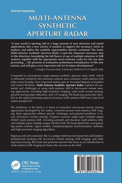 Introduction. Background Material. Azimuth Multi Antenna SAR. Elevation Plane Multi Antenna SAR. MIMO SAR Waveform Diversity and Design. MIMO SAR in High Resolution Wide Swath Imaging. MIMO SAR in Moving Target Indication. Distributed Multi Antenna SAR Time and Phase Synchronization. Distributed Multi Antenna SAR Antenna Synchronization. Azimuth Variant Multi Antenna SAR Image Formation Processing. Multi Antenna SAR Three Dimensional Imaging. Bibliography. Index.