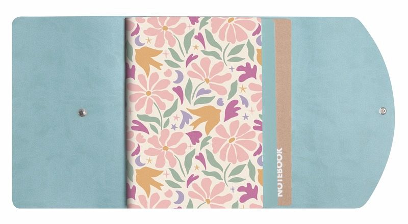 Clover Celeste. 3-teilige Hülle mit 3 Notizheften A5 mit 32 Blatt: 2x liniert und 1x blanko. Hülle aus PU mit gekörnten Ledereffekt (Design Celeste). Mit praktischem Druckknopf und Gummibändern zur Fixierung der Notizhefte. Die Notizhefte mit Designs der Kollektionen Paloma, Elise und Kraft . Die Hülle ist mit A5-Notizheften nachfüllbar. Mit den 3 Notizheften gelingt eine persönliche oder berufliche Organisation nach Themen, für jedes Thema 1 Notizheft.