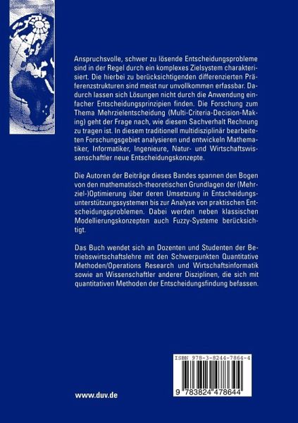 Die Autoren der Beiträge dieses Bandes spannen den Bogen von den mathematisch-theoretischen Grundlagen der (Mehrziel-)Optimierung über deren Umsetzung in Entscheidungsunterstützungssystemen bis zur Analyse von praktischen Entscheidungsproblemen. Dabei werden neben klassischen Modellierungskonzepten auch Fuzzy-Systeme berücksichtigt.
