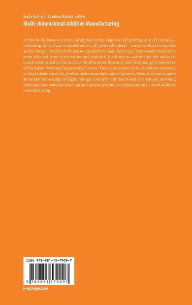 In this book, basic sciences and applied technologies in 3D printing and 2D coating-including 2D surface modulations on 3D printed objects-are described to explore and to image novel multidimensional additive manufacturing. Renowned researchers were selected from universities and national institutes as authors by the editorial board established in the Surface Modification Research and Technology Committee of the Japan Welding Engineering Society. The main readers of this book are expected to be graduate students, professional researchers, and engineers. Here, they can acquire abundant knowledge of digital design concepts and functional evaluations, enabling them practice material selection and process parameter optimization in novel additive manufacturing.