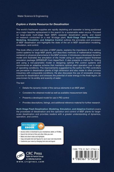 Explore a Viable Resource for Desalination The world's freshwater supplies are rapidly depleting and seawater is being positioned as a major feasible replacement in the search for a sustainable water source. Focused on large-scale multi-stage flash (MSF) seawater desalination plants, and based on research conducted on a real 18-stage plant, Multi-Stage Flash Desalination: Modeling, Simulation and Adaptive Control outlines the principles and processes of MSF desalination and highlights the state of the art in MSF desalination modeling, simulation, and control. This book offers a brief overview of MSF plants, explains the importance of the various control systems for large MSF plants, and describes methods of mathematical modeling centered on physical phenomena in the MSF process. It introduces a developed dynamic model and illustrates the simulation of the model using an equation-based flowsheet simulation package (SPEEDUP) from AspenTech. It also presents a method for finding and using a non-parametric model in designing optimal PID control systems and recommends an adaptive scheme that maintains optimal plant operation over a range of operating conditions. The improvements suggested by the author for PID controllers are pervasive in desalination plants of high dimension and also relate to other process industries with comparable conditions. He also discusses the use of renewable energy sources for desalination and stresses the potential of solar energy in the Arab region, an area known for its aridity and scarcity of water. The text: Details the dynamic model of the various elements in an MSF plant Considers the obtained model as well as available measurement data Presents a developed model for use in PID control Provides descriptions, listings, and additional reference material for further research Multi-Stage Flash Desalination: Modeling, Simulation and Adaptive Control covers the processes of desalination and the operation and control of MSF plants for large-scale desalination and provides you with a greater understanding of dynamics, operation, and control.