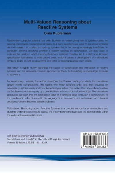 Traditionally computer science has been Boolean in nature giving rise to systems based on proving correctness. Correctness is binary, but many questions we want to ask about systems are multi-valued. In modern computing systems this is becoming increasingly insufficient. In particular, beyond checking whether a system satisfies its specification, we may want to evaluate the quality in which the specification is satisfied. This has led to a shift from Boolean specification formalisms to multi-valued ones, which involves a development of multi-valued temporal logics as well as algorithms and tools for reasoning about such logics. This timely in-depth review describes the basics of specification and verification of reactive systems, and the automata-theoretic approach for them: by translating temporal-logic formulas to automata. As introductory material, the author describes the Boolean setting in which the formalisms specify infinite computations. This begins with linear temporal logic, and then focusses on automata on infinite words and their theoretical properties. The author then shows how to refine the Boolean correctness query by a quantitative one in two multi-valued settings. The formalisms introduced are such that the satisfaction value of a temporal-logic formula in a computation, or the membership value of a word in the language of an automaton, are multi valued, and classical decision problems become search problems. Multi-Valued Reasoning about Reactive Systems is a concise source for all researchers and students wishing to understand quickly the theory behind the topic and the context it has within the wider active research branch.