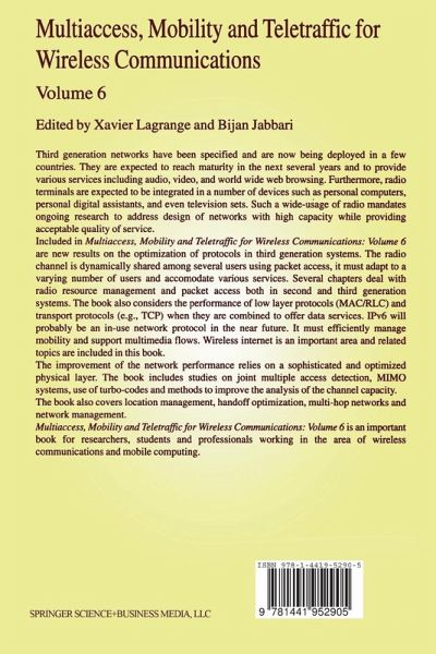 Third generation networks have been specified and are now being deployed in a few countries. They are expected to reach maturity in the next several years and to provide various services including audio, video, and world wide web browsing. Furthermore, radio terminals are expected to be integrated in a number of devices such as personal computers, personal digital assistants, and even television sets. Such a wide-usage of radio mandates ongoing research to address design of networks with high capacity while providing acceptable quality of service. This volume is the sixth in the edited series Multiaccess, Mobility and Teletraffic for Wireless Communications. It presents the selected papers for the proceedings of the Seventh Workshop (MMT'2002) held on this topic in June 2002 in Rennes, France. The aim of this workshop has been to address a set of important issues of interest to the wireless communications community. In particular, the focus of this workshop is to identify, present and discuss the theoretical and implementation issues critical to the design of land based mobile cellular and microcellular as well as wireless local area networks. Included in this book are recent research results on performance analysis of wireless packet networks, channel coding and receiver design, radio resource management in third generation systems, mobility management in cellular and mobile IP networks, performance of transport protocols (TCP) over radio link control protocols, and ad-hoc networks.